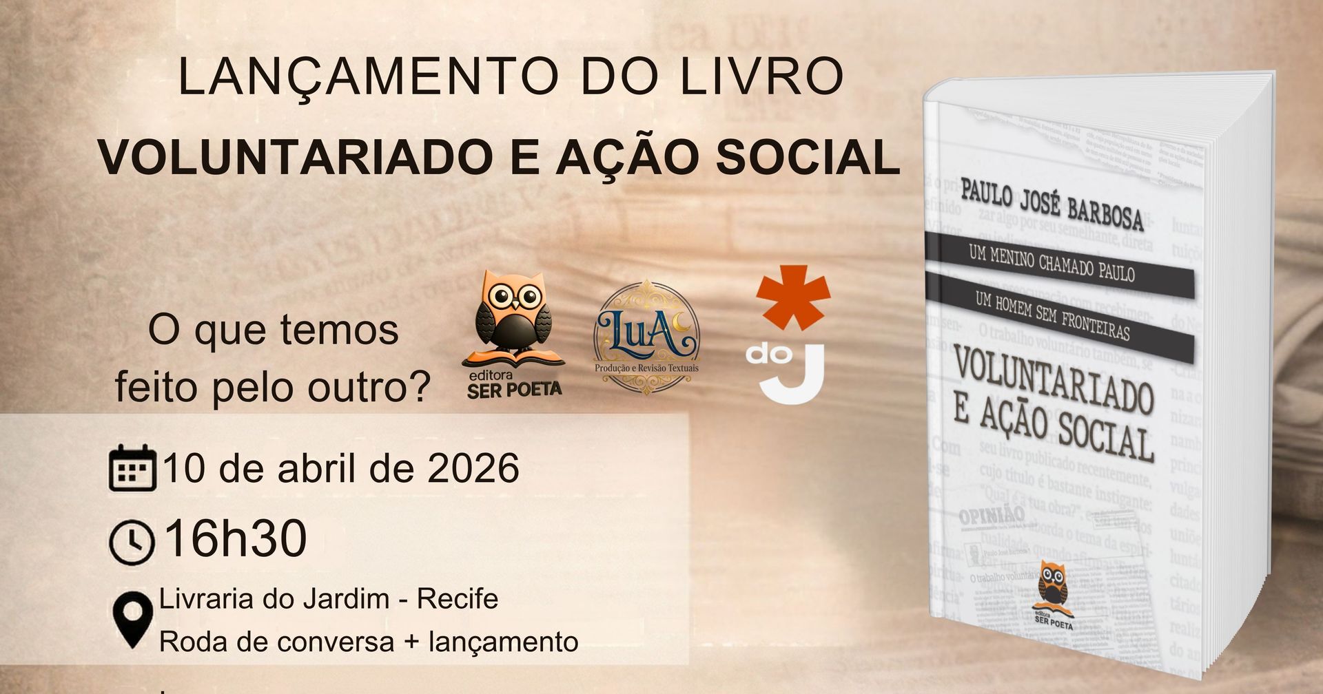 No próximo dia 10, às 16h30, a Livraria do Jardim, no bairro da Boa Vista, torna-se o epicentro de uma discussão necessária sobre solidariedade e cidadania. O lançamento do livro "Voluntariado e Ação Social: Um Menino Chamado Paulo, Um Homem Sem Fronteiras" chega ao público em um evento que une celebração literária e pensamento crítico sobre o impacto social na capital pernambucana.