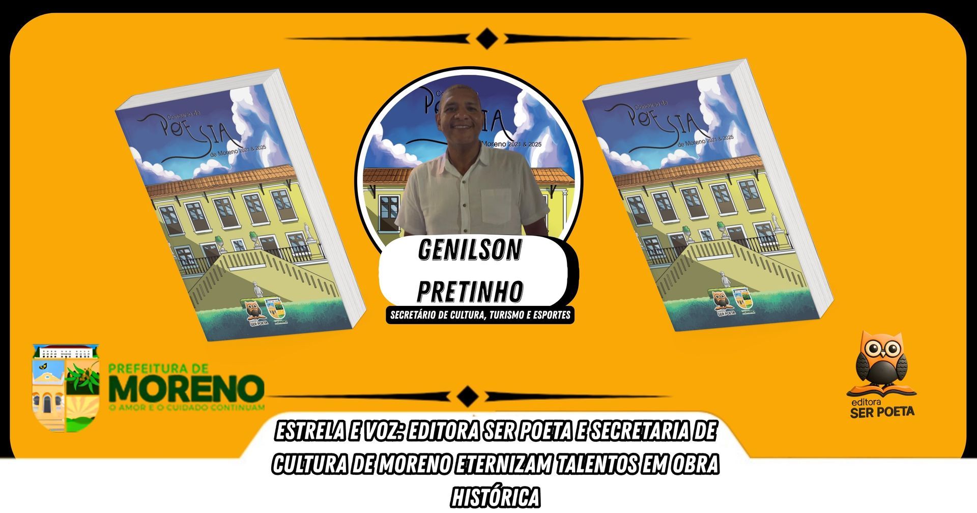 "O projeto Concurso de Poesia é muito mais do que uma competição: é uma celebração da arte e da alma dos nossos poetas para consolidar a literatura como prática essencial em Moreno." Secretário de Cultura, Turismo e Esportes, Genilson Pretinho